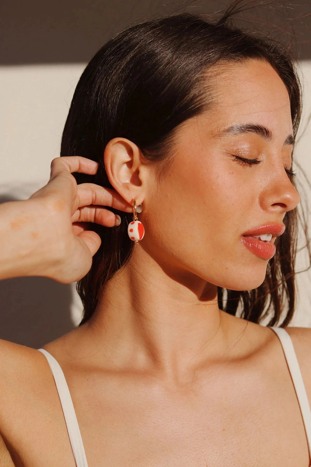These new drop earrings are sweet like candy. With trendy red heart-painted charms on gold-toned hoops, this pair will be a new staple in your earring collection. Pair them with our Sour Cherry Necklace.